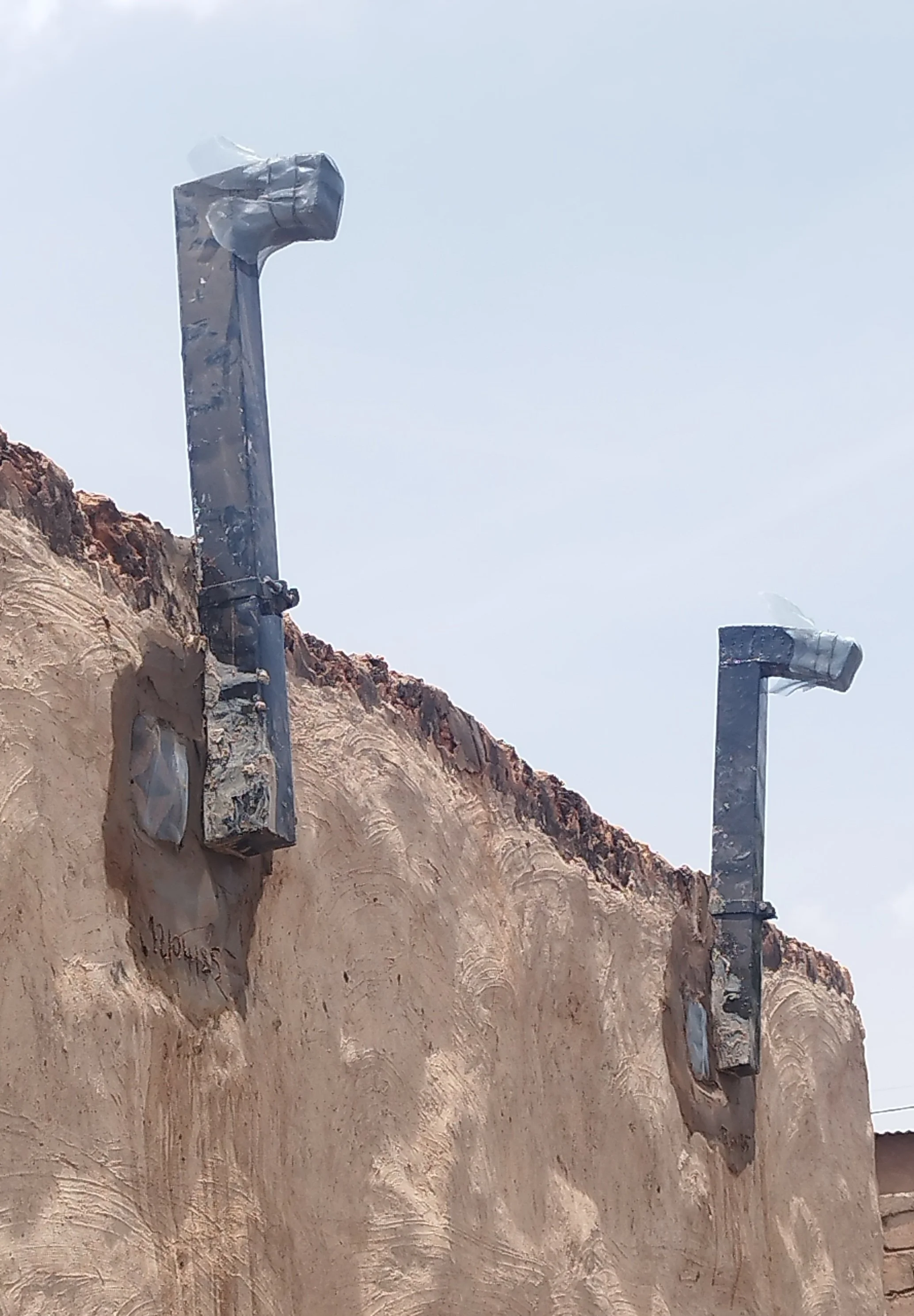 Design interventions to improve the thermal comfort in informal settlements in the hot arid climate of Burkina Faso have been investigated with a thermal dynamic building simulation tool. The goal is to find cost effective methods to reduce the heat stress of occupants of settlements in the global south. Improvements to reduce the room and surface temperature as well to increase the room air velocity have been compared. Technical recommendations have been provided for realized test buildings in Burkina Faso. One part of the research work was the design of a simple solar chimney to provide better ventilation (image).