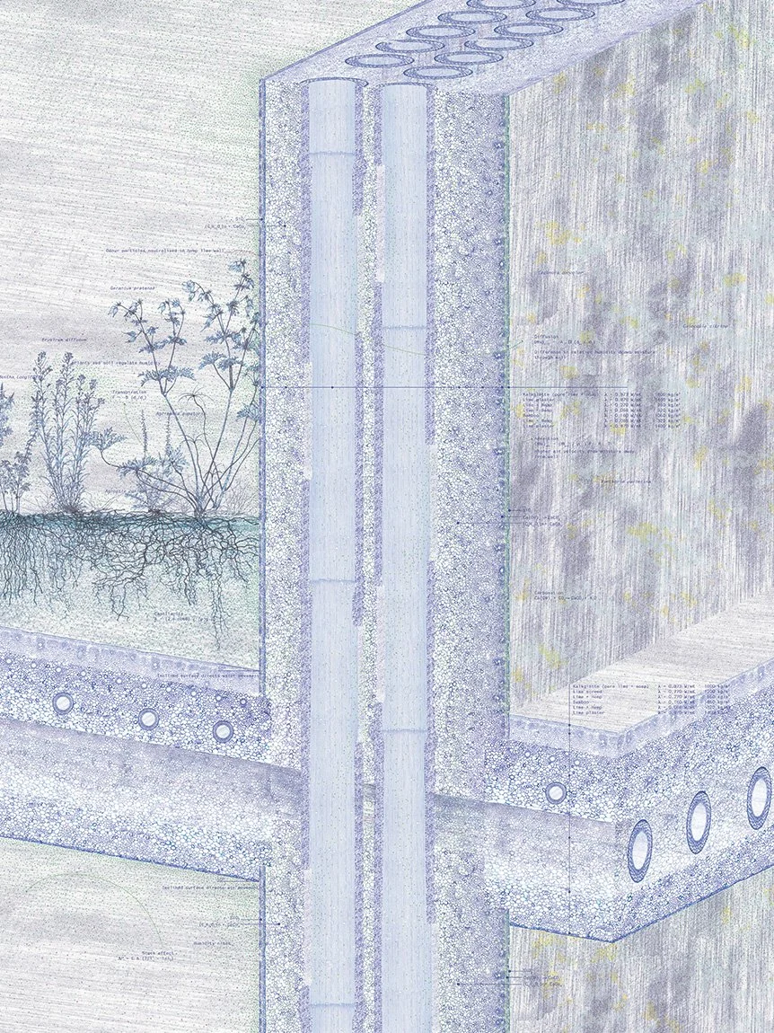 The natural ventilation system was a contribution to the Biennale Exhibition in the year 2025. It illustrates the interaction of the natural driven environmental control system with the bio-based material hempcrete.
